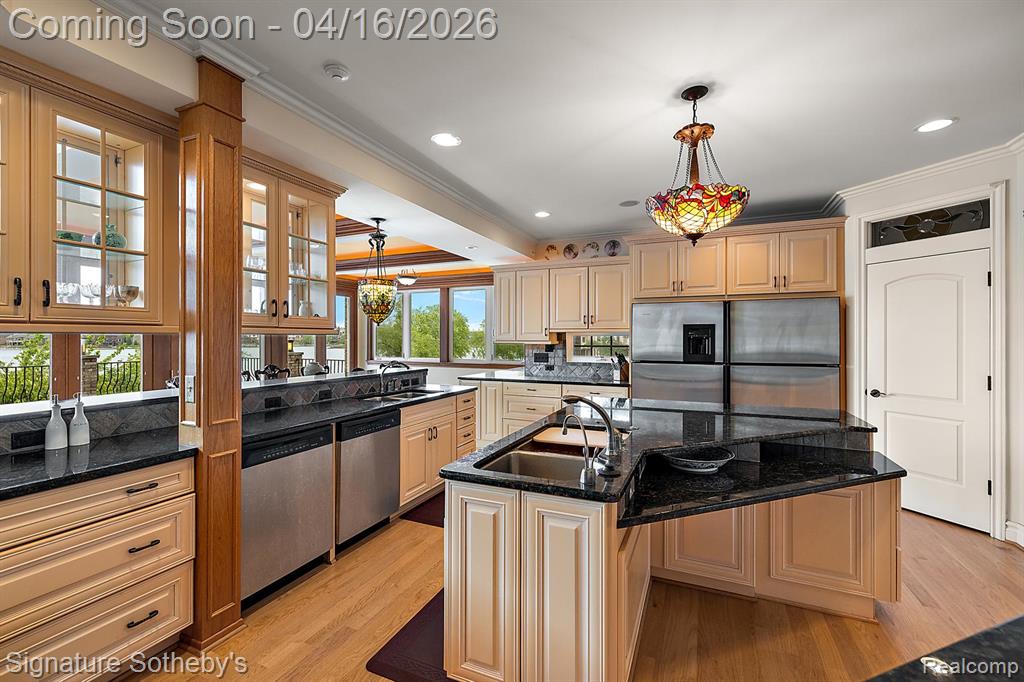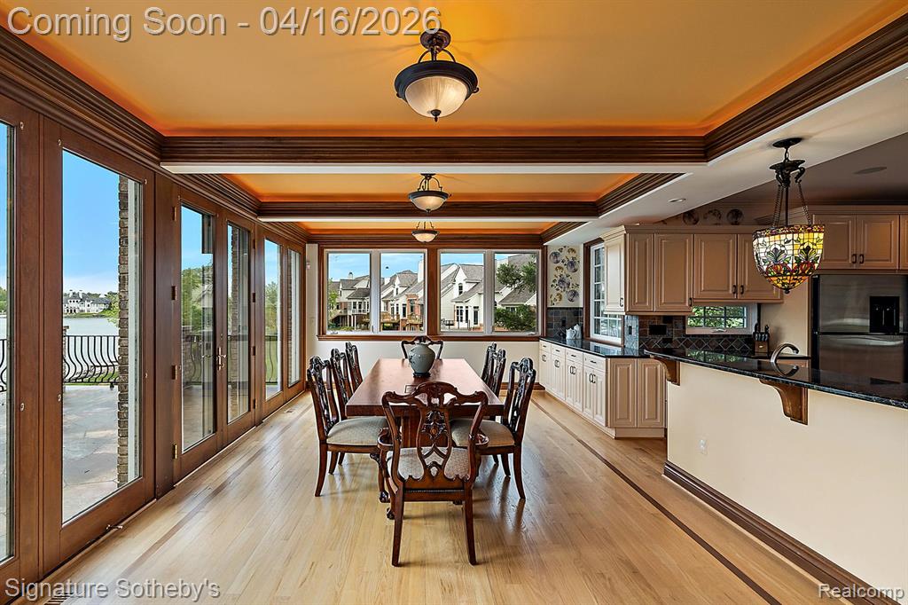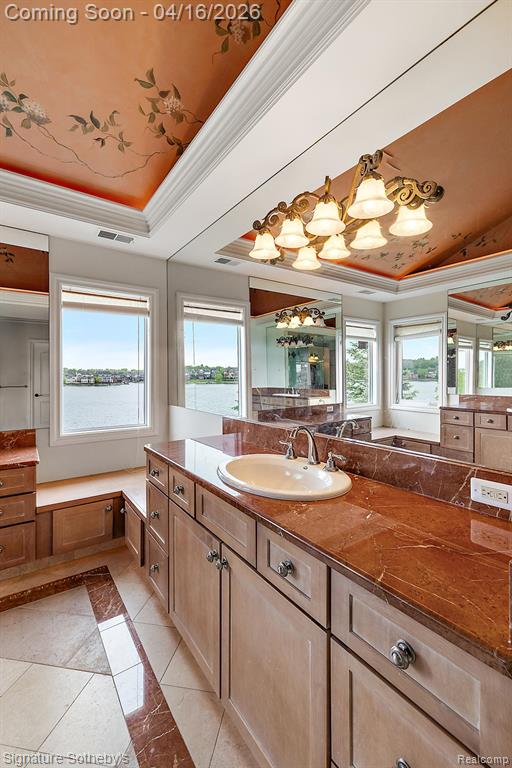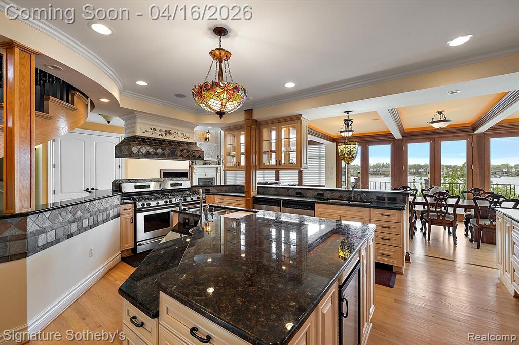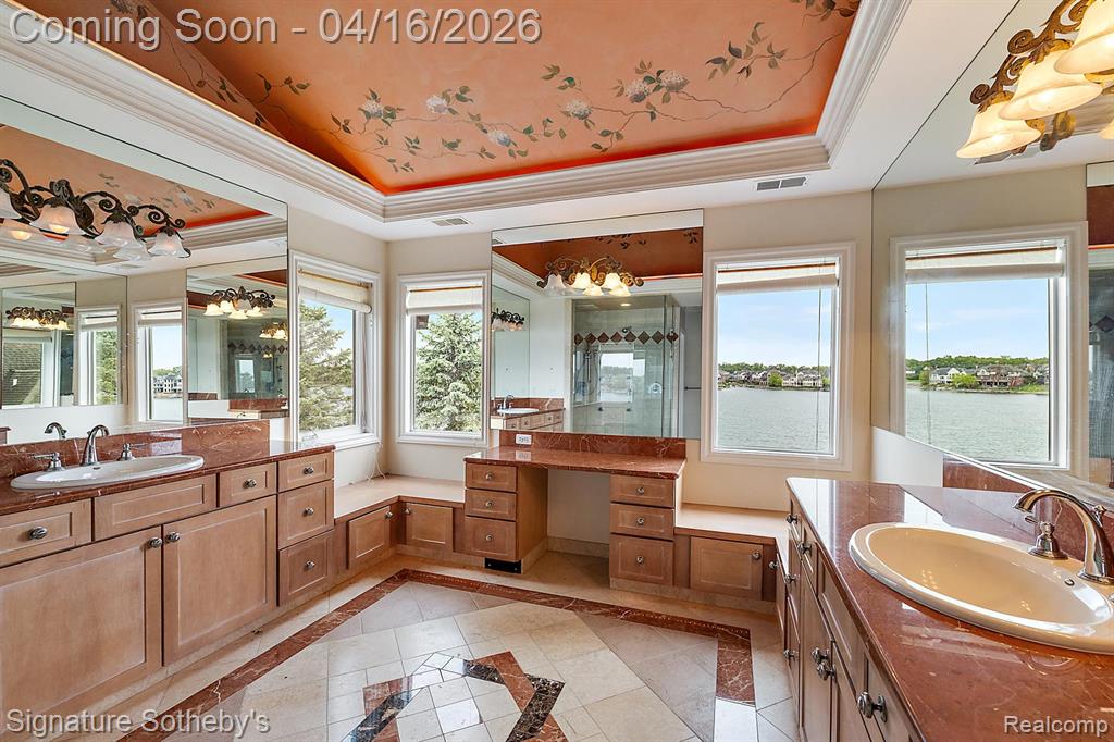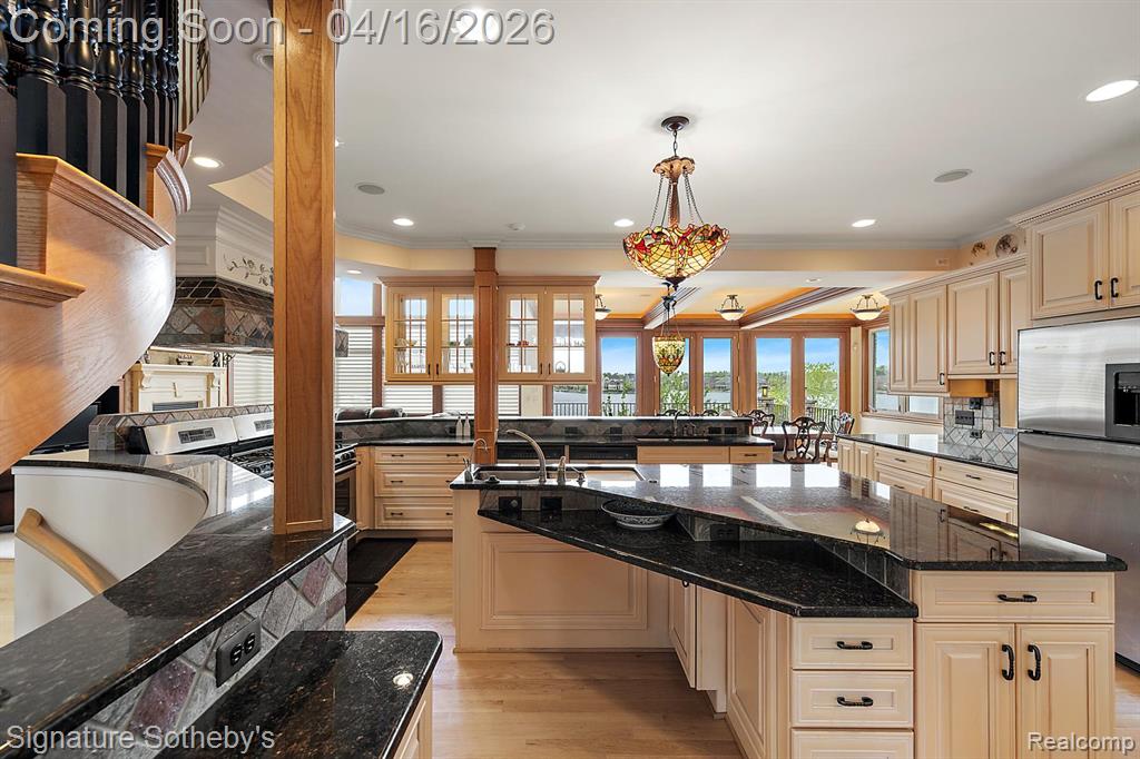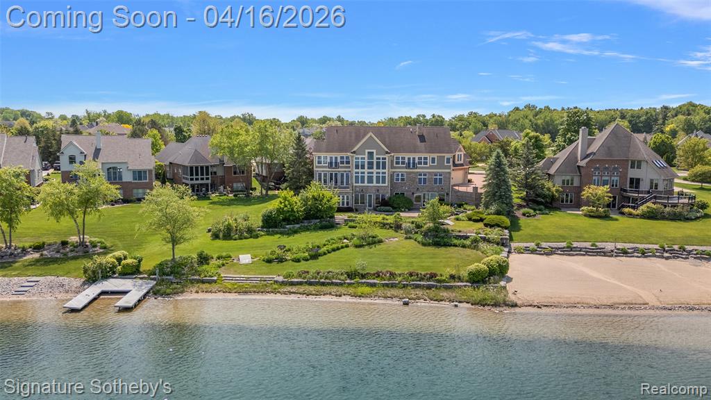 Magnificent, sprawling, custom built home ideally located with a panoramic lake view on Hidden Lake’s finest lot. Intricate, stunning staircase leading to 2 primary suites with mood lit tray ceilings, fireplaces and balconies overlooking Hidden Lake. Hydronic in floor radiant heating throughout including driveway and sidewalks! Main floor features a breakfast nook leading to the large deck with lake view. Home features an elevator to reach each level and boasts a 6 car heated garage. Wonderfully unique features including private home theater, indoor swimming pool, hot tub and sauna, sophisticated library and an elegant wine cellar amongst countless other stunning features. Lower level with walk-out full kitchen, dance floor, gaming and workout area. Beautiful landscaping adorns this idyllic lakefront home. |